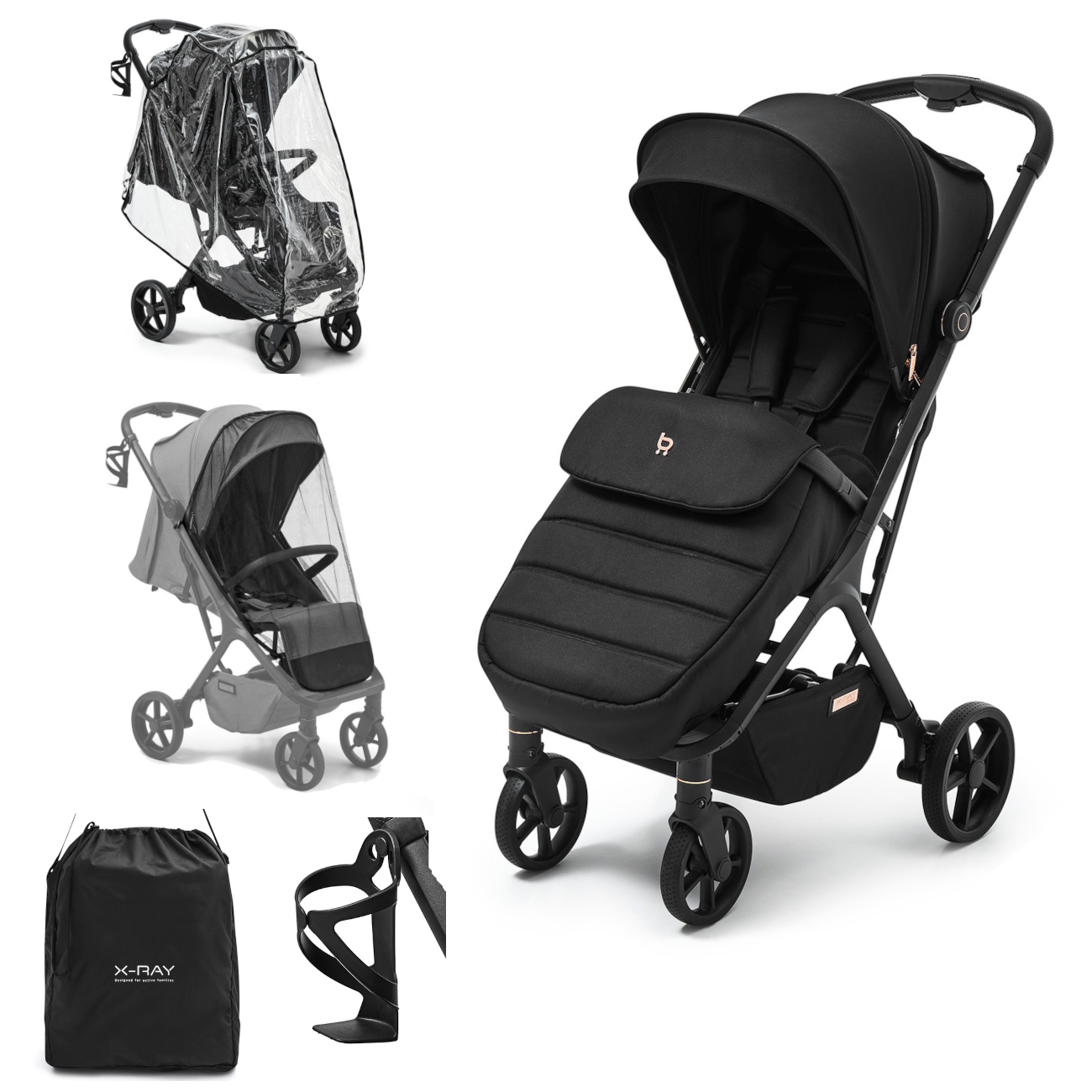 Wózek X-RAY PRO wyposażony jest w komplet przydatnych akcesoriów, takich jak osłona przeciwdeszczowa, moskitiera, uchwyt na kubek oraz ocieplany pokrowiec pełniący funkcję śpiworka w chłodniejsze dni.